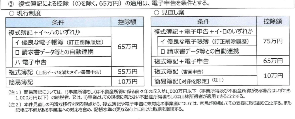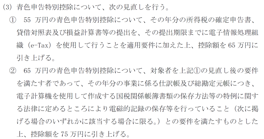 ここでは、〔延長・拡充〕として、所得税の青色申告控除が75万円に拡充することが言われていますが、その裏で。。。